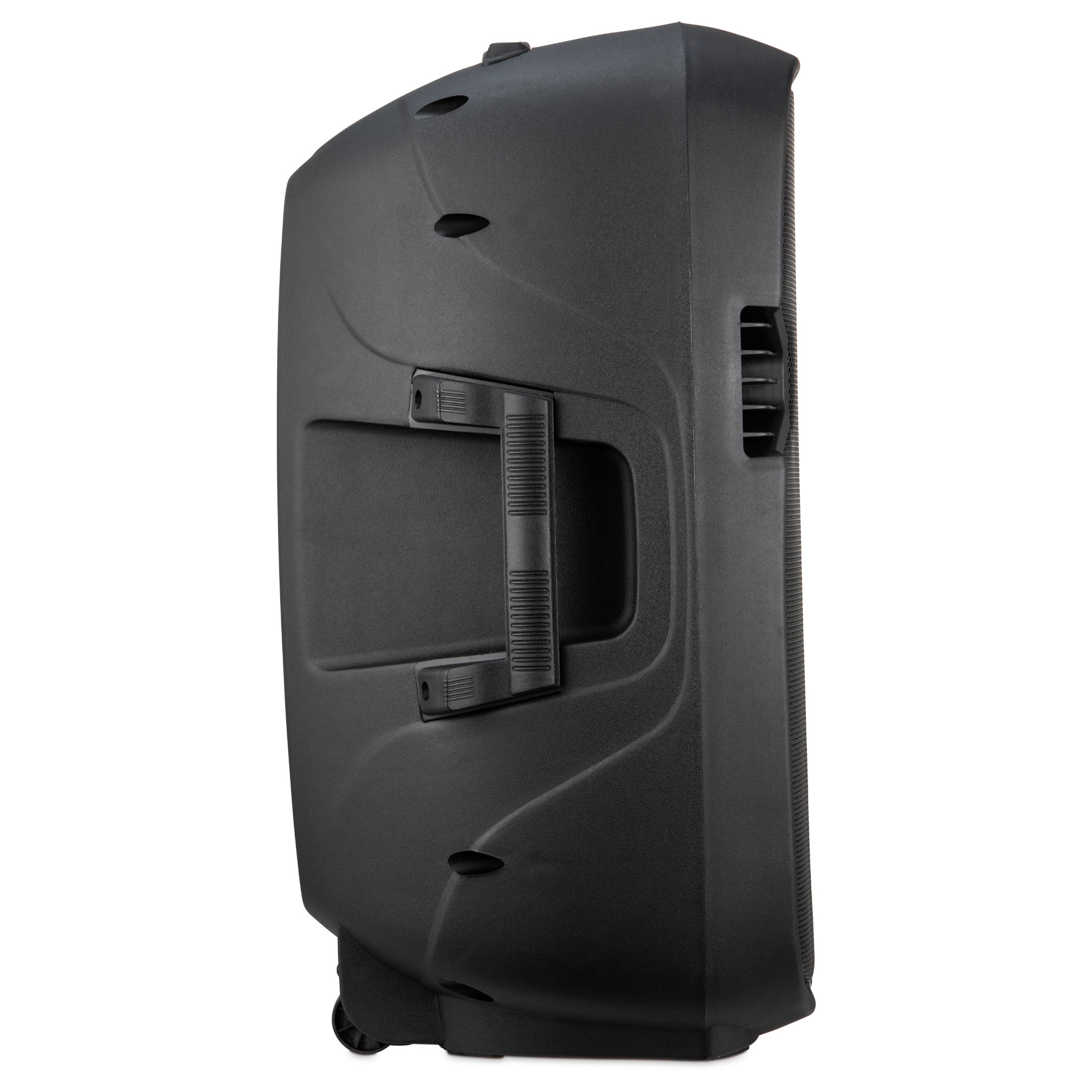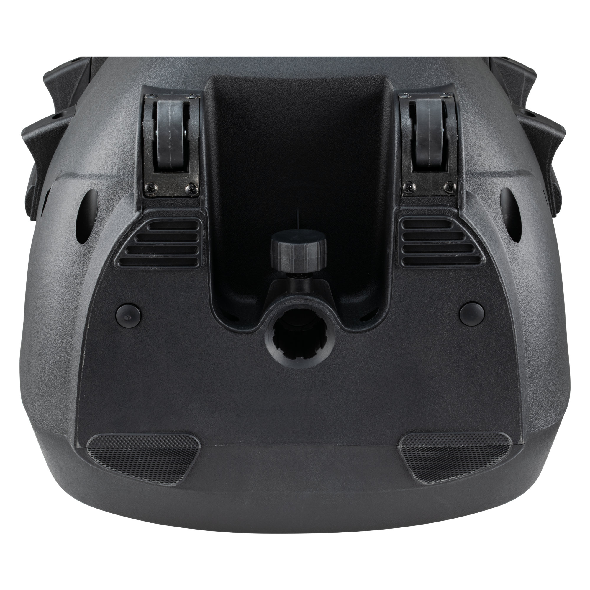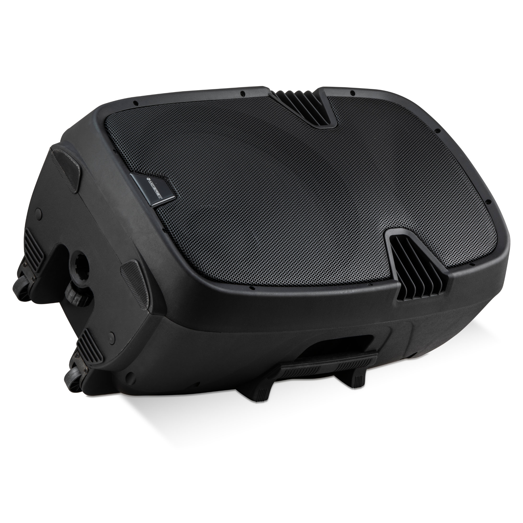 Selbstverständlich lässt sich die Lautsprecherbox gleichermaßen stehend oder auch liegend verwenden. Somit steht der Verwendung als Monitor nichts im Wege. Durch den Flanscheinsatz kann der Speaker auch auf einem herkömmlichen Lautsprecherstativ montiert werden. Für den Transport befinden sich an der Unterseite zwei Rollen, wodurch der Lautsprecher rückenfreundlich gezogen werden kann.