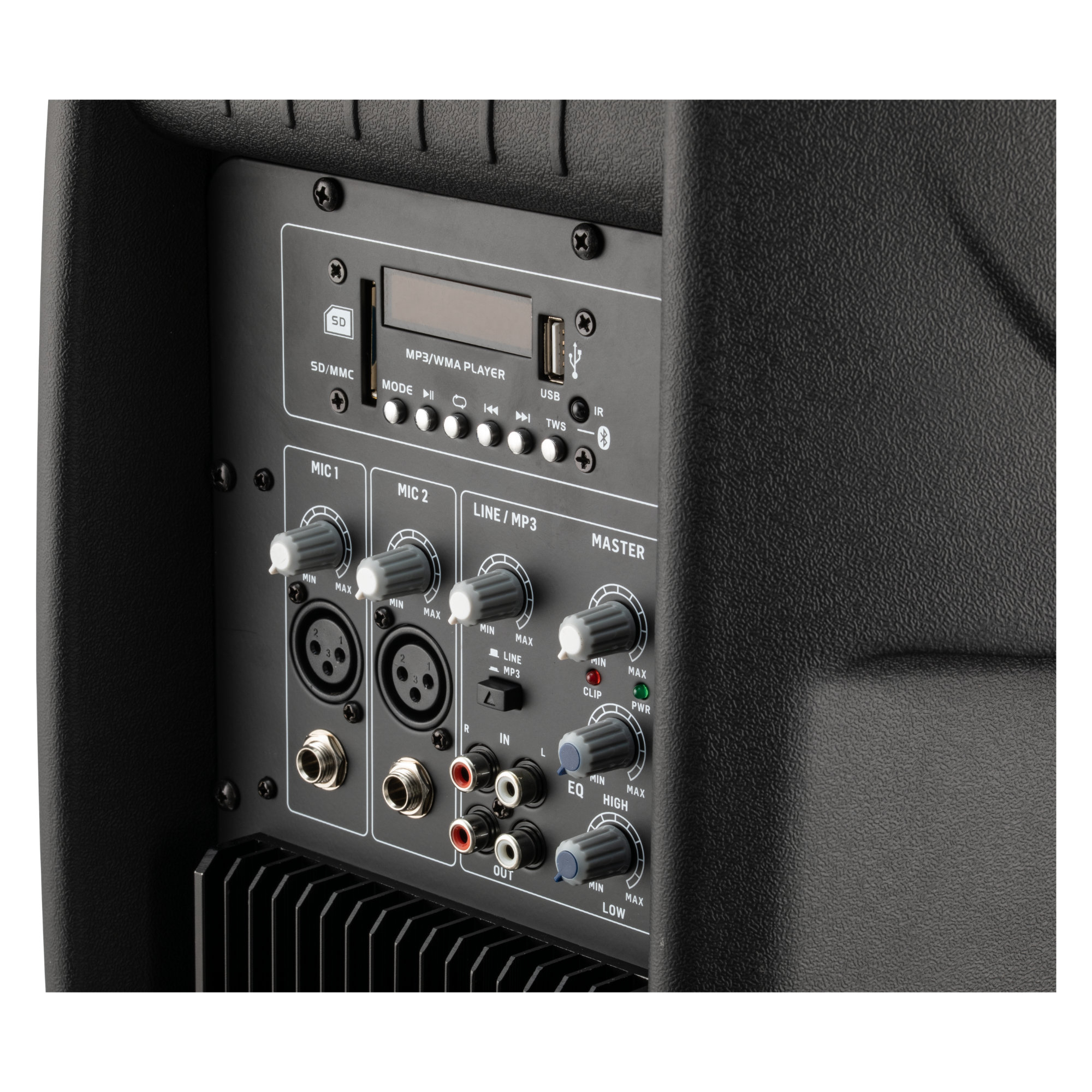 Die Eingangssektion der P215 MA bietet maximale Flexibilität: Der Fullrange-Lautsprecher verfügt über zwei Mikrofon-Eingänge (XLR/Klinke) zum direkten Anschluss von dynamischen Mikrofonen sowie einen Line-Input im Cinch-Format für Signale vom Mischpult, CD/MP3-Player oder Instrumente mit Line-Pegel (Keyboards, E-Pianos, etc.). Alle Eingänge lassen sich getrennt in der Lautstärke regeln. Zudem verfügt der Lautsprecher über einen 2-Band-Equalizer (High/Low) in der Mastersektion.