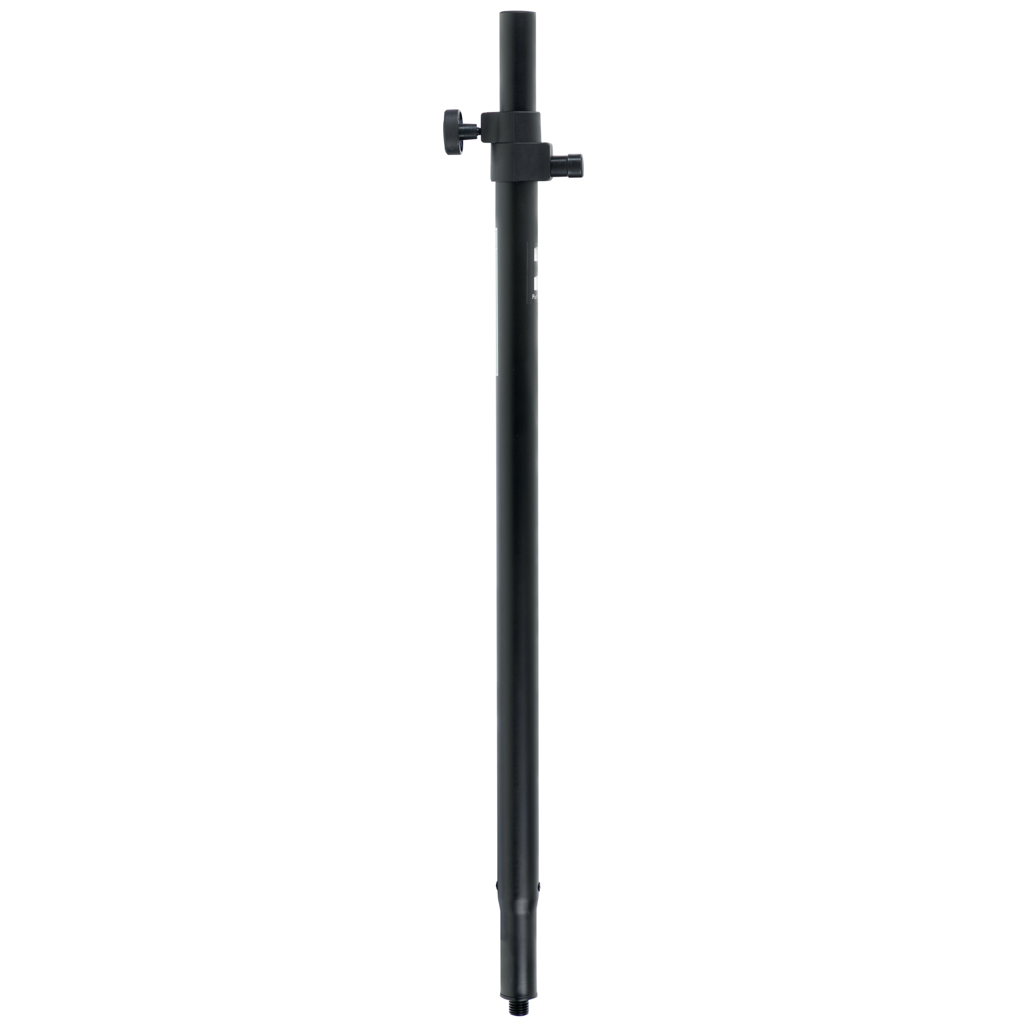 Das untere Ende des Rohres passt praktischerweise auf beide Varianten: sowohl auf Subwoofern mit M20-Gewinde als auch auf gängigen 35mm-Flanschen kann die Stange montiert werden. Die Länge des Gewindes beträgt 18mm, weitere 8,5cm des Rohres können in einen 35mm-Boxenflansch gesteckt werden. Das Distanzrohr besitzt einen praktischen Bolzen, welcher durch eine Feder selbstständig in eine der 5 Aussparungen einrastet. Das verhindert ein unbeabsichtigtes Abstürzen der Box beim Auf- und Abbau. Die Länge kann dabei zwischen 90 und 150 cm gewählt werden.