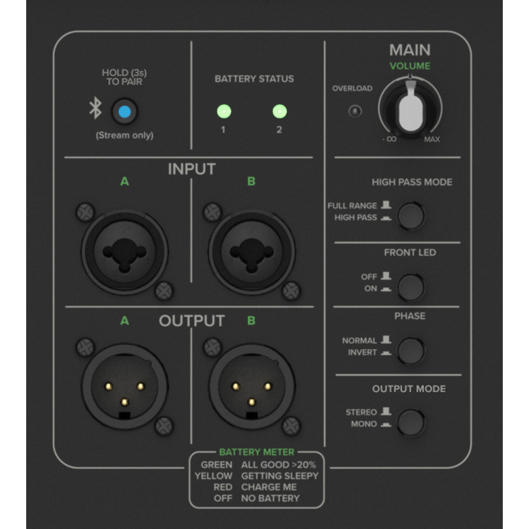 - Funktionen: Hochpassfilter, Phase Invert, LED-Anzeigen