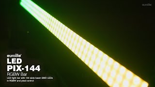 Ausgestattet mit 144 SMD-LEDs in den Farben Rot, Grün, Blau und Weiß liefert die 100 cm lange PIX-144 Leiste eine flickerfreie Projektion. Sie ist in 8 Pixel unterteilt (Leuchteinheiten mit jeweils 18 LEDs), die individuell über DMX angesteuert werden können. Dazu bietet der LED-Bar statische Farben, eine RGBW-Farbmischung, interne Programme, eine Dimmer-Funktion sowie einen Strobe-Effekt. Alles über DMX oder den Master/Slave-Modus einstellbar.