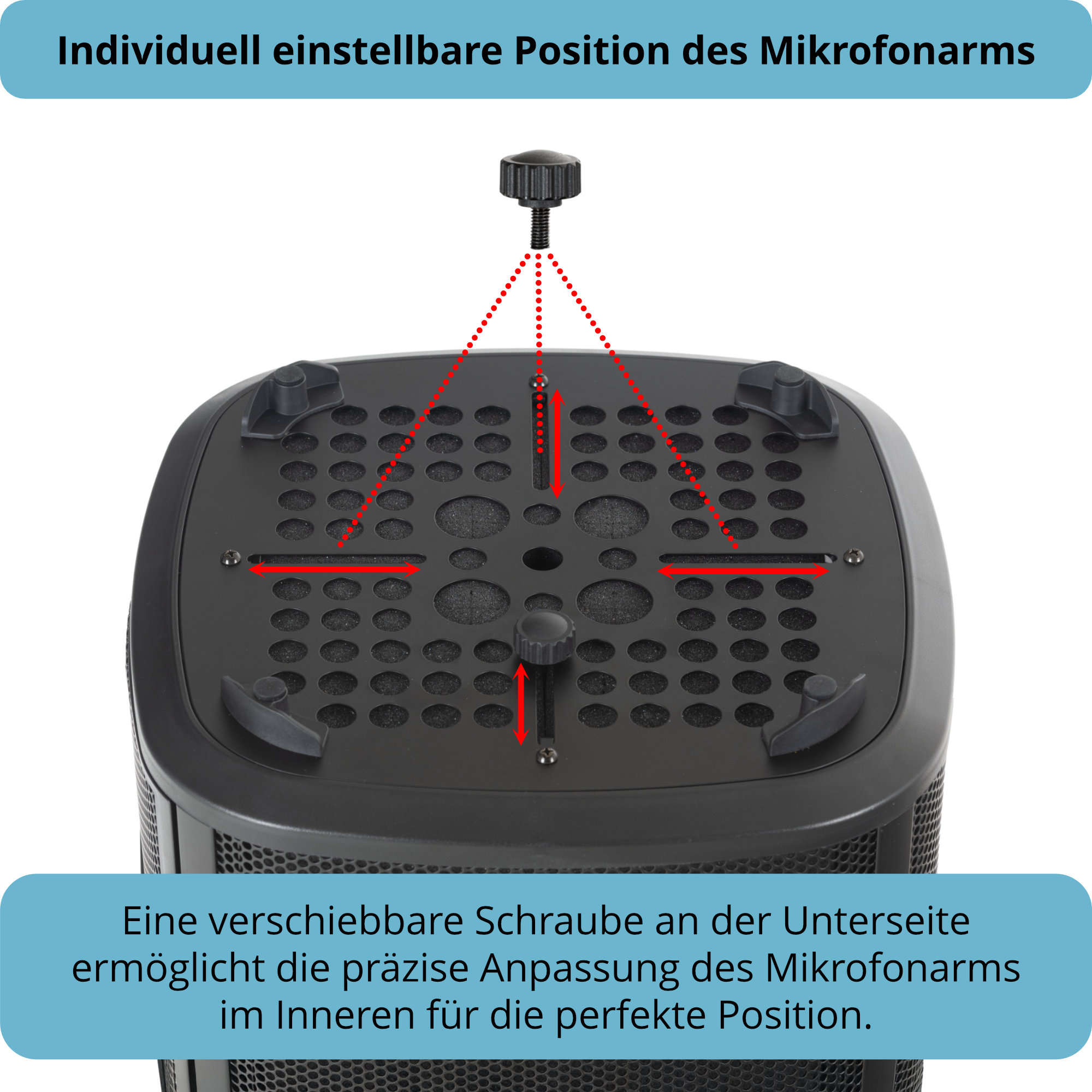 Im Inneren der Aufnahmebox befindet sich ein beweglicher und höhenverstellbarer Mikrofonarm mit einem 5/8"-Adapter. Daran können Halterungen, Klemmen und Spinnen für verschiedenste Mikrofontypen montiert und präzise positioniert werden.