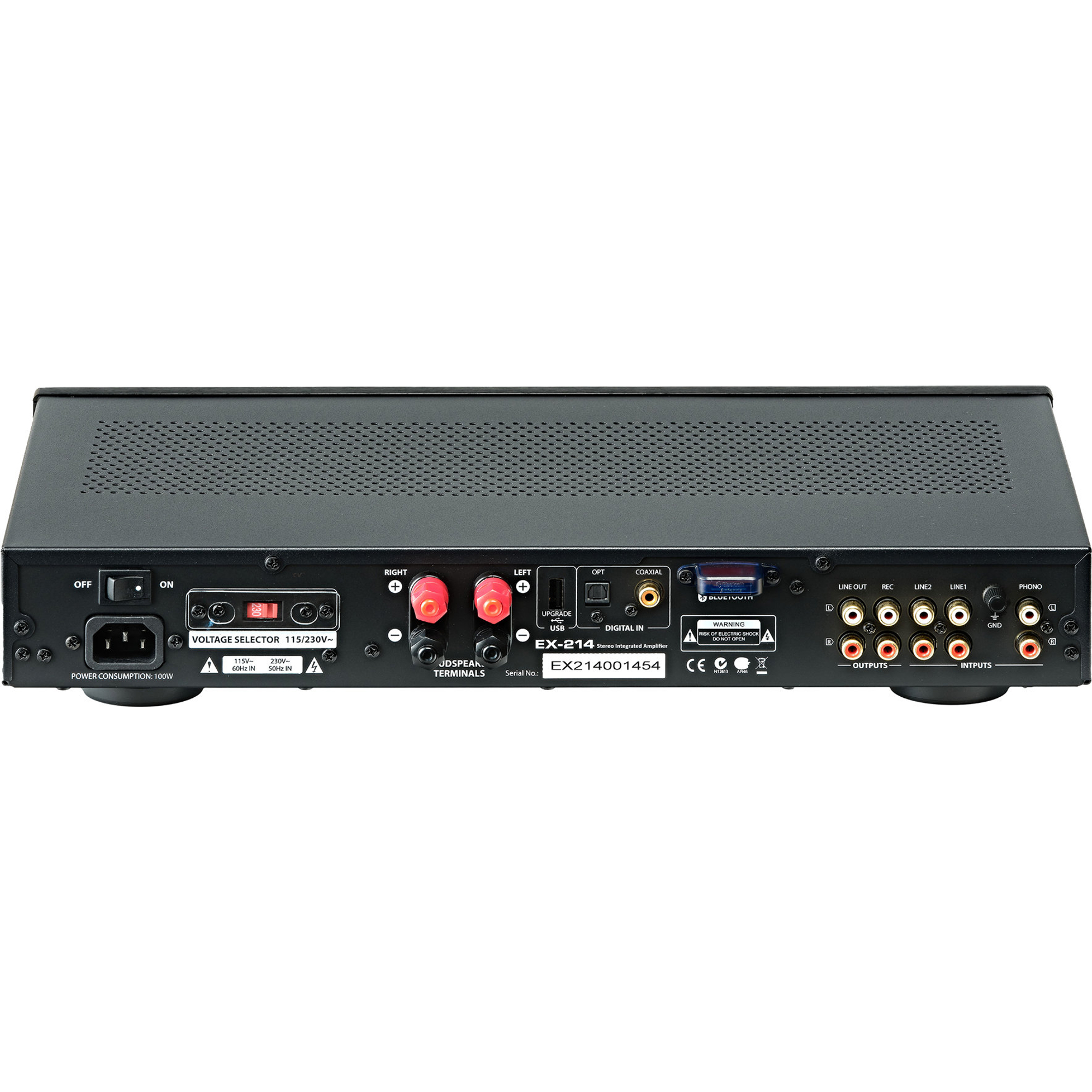 Der EX-214 bietet zwei unsymmetrische Audioeingänge, einen frontseitigen AUX-Anschluss (3,5 mm Klinke), einen Phono- und einen digitalen Eingang (koaxial und/oder optisch), der den Anschluss an Fernsehgeräte der neuesten Generation ermöglicht. Darüber hinaus verfügt er über einen "Pre-Out" für Bi-Amping oder den Anschluss eines Subwoofers.