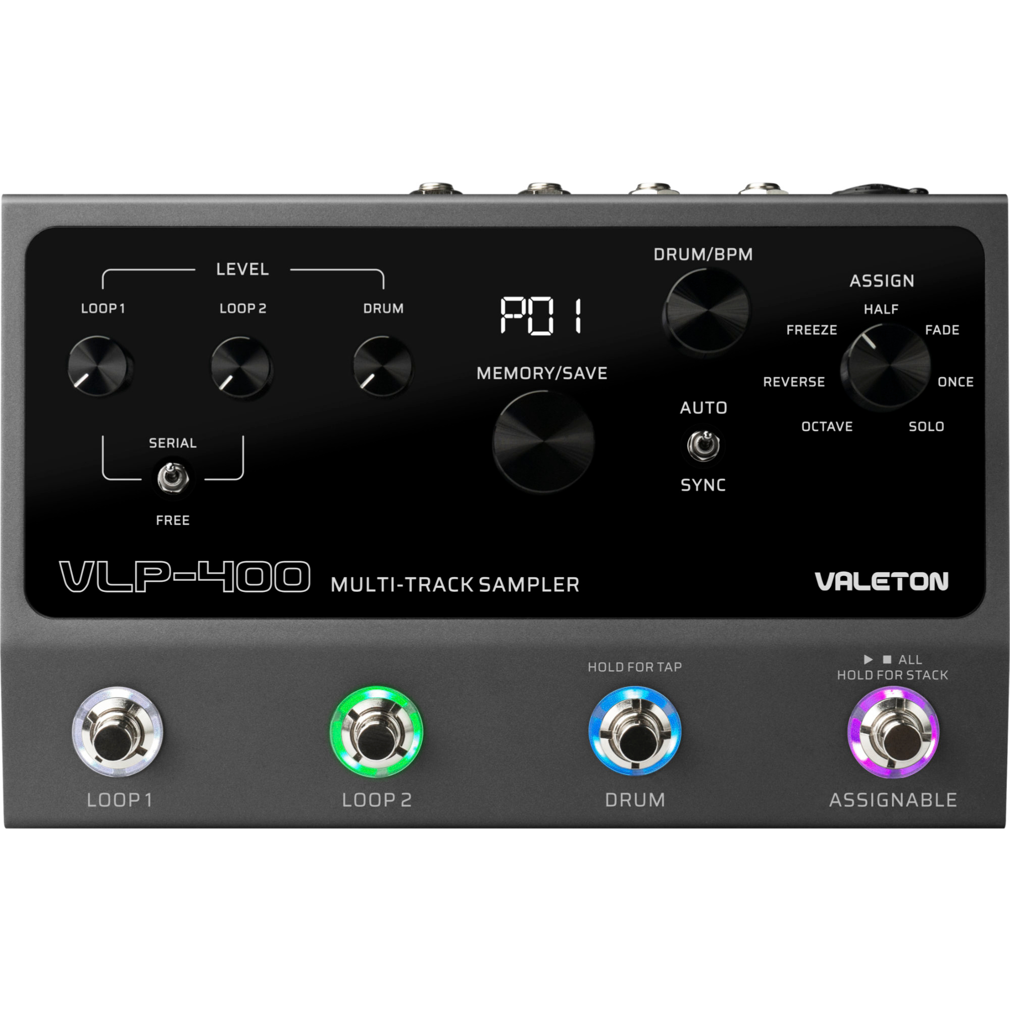 Im Vergleich zum VLP-200 hat der VLP-400 jetzt ASSIGN-Regler und ASSIGNABLE-Fußschalter, mit denen du deinen Sound noch besser gestalten kannst. Mit nur wenigen Drehungen der Regler kannst du 7 Effekte für deine Loops aktivieren, darunter OCATVE, REVERSE, FREEZE, HALF, FADE, ONCE und SOLO. Wenn diese Effekte aktiv sind, leuchten die Fußschalter violett. Durch zweimaliges Antippen des ASSIGNABLE-Fußschalters kannst du den Loop und die Drum-Machine gleichzeitig stoppen und starten, was dir eine dynamischere Steuerung ermöglicht.