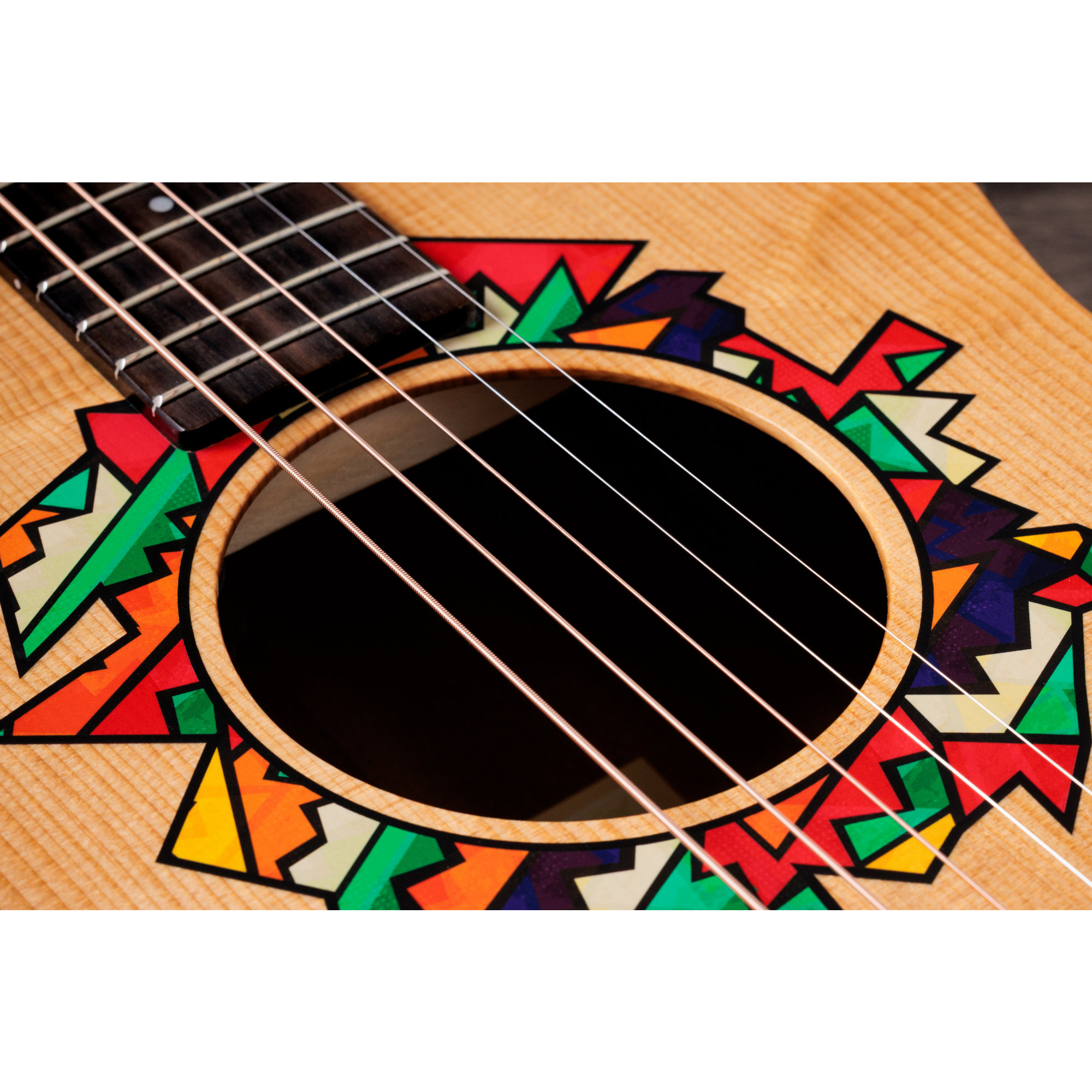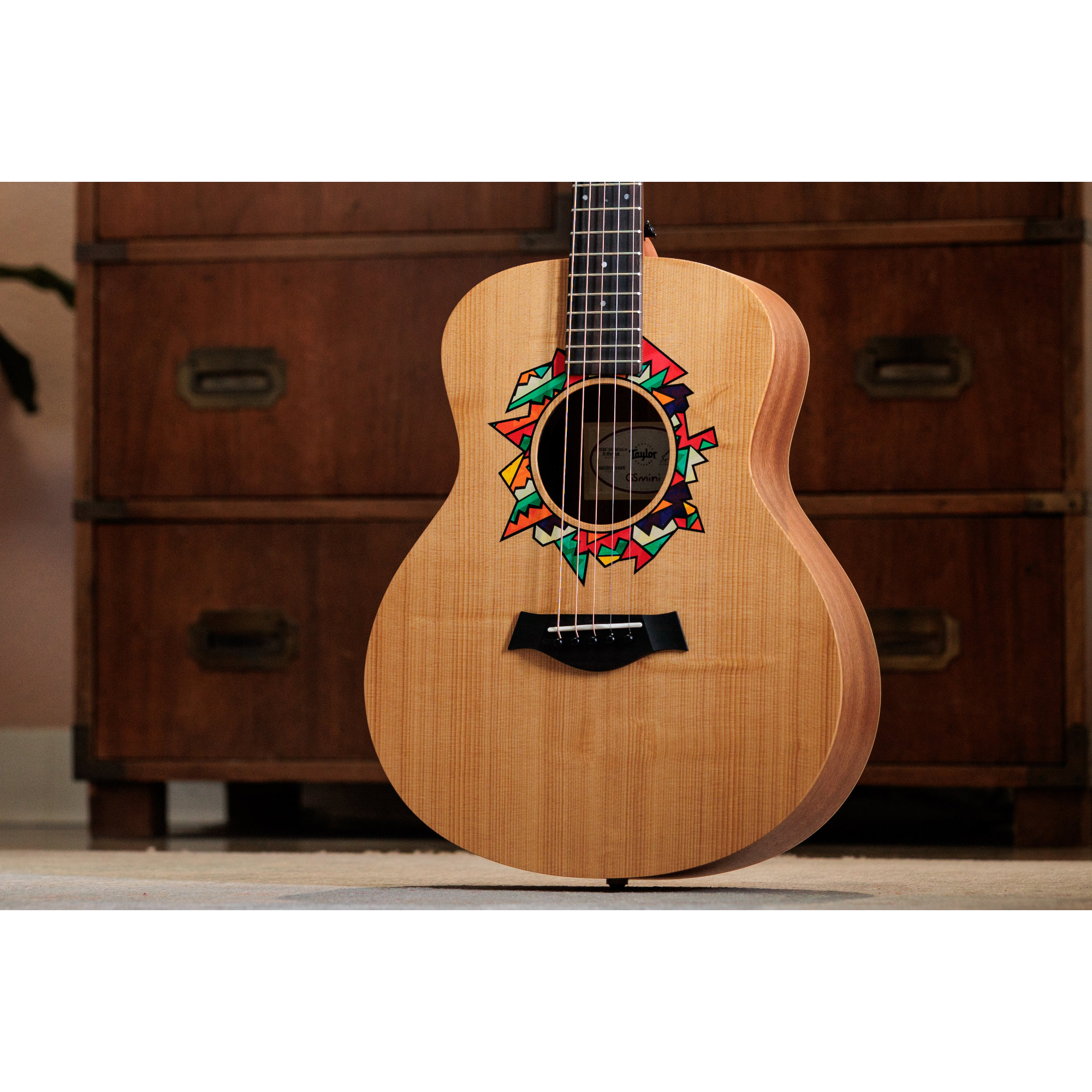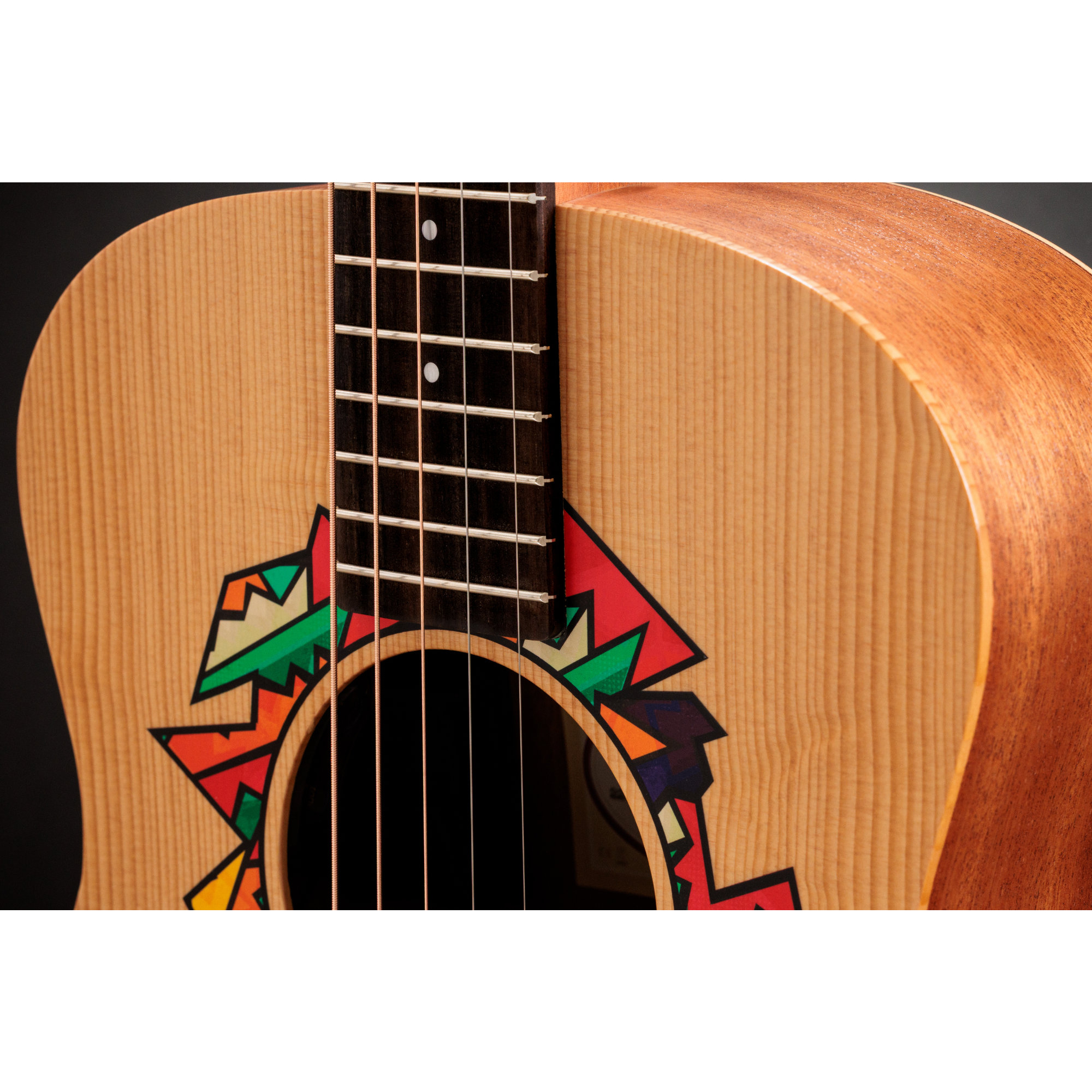 Inspiriert von der kraftvollen Klangfarbe, den kompakten Proportionen und der vielseitigen Persönlichkeit der GS Mini hat Jacob dem beliebten Taylor-Modell seinen ganz eigenen ästhetischen Stempel aufgedrückt. In Zusammenarbeit mit den Designern von Taylor hat Jacob ein individuelles asymmetrisches Rosetten-Design entworfen, das sich durch lebendige Farben und geometrische Abstraktion auszeichnet.