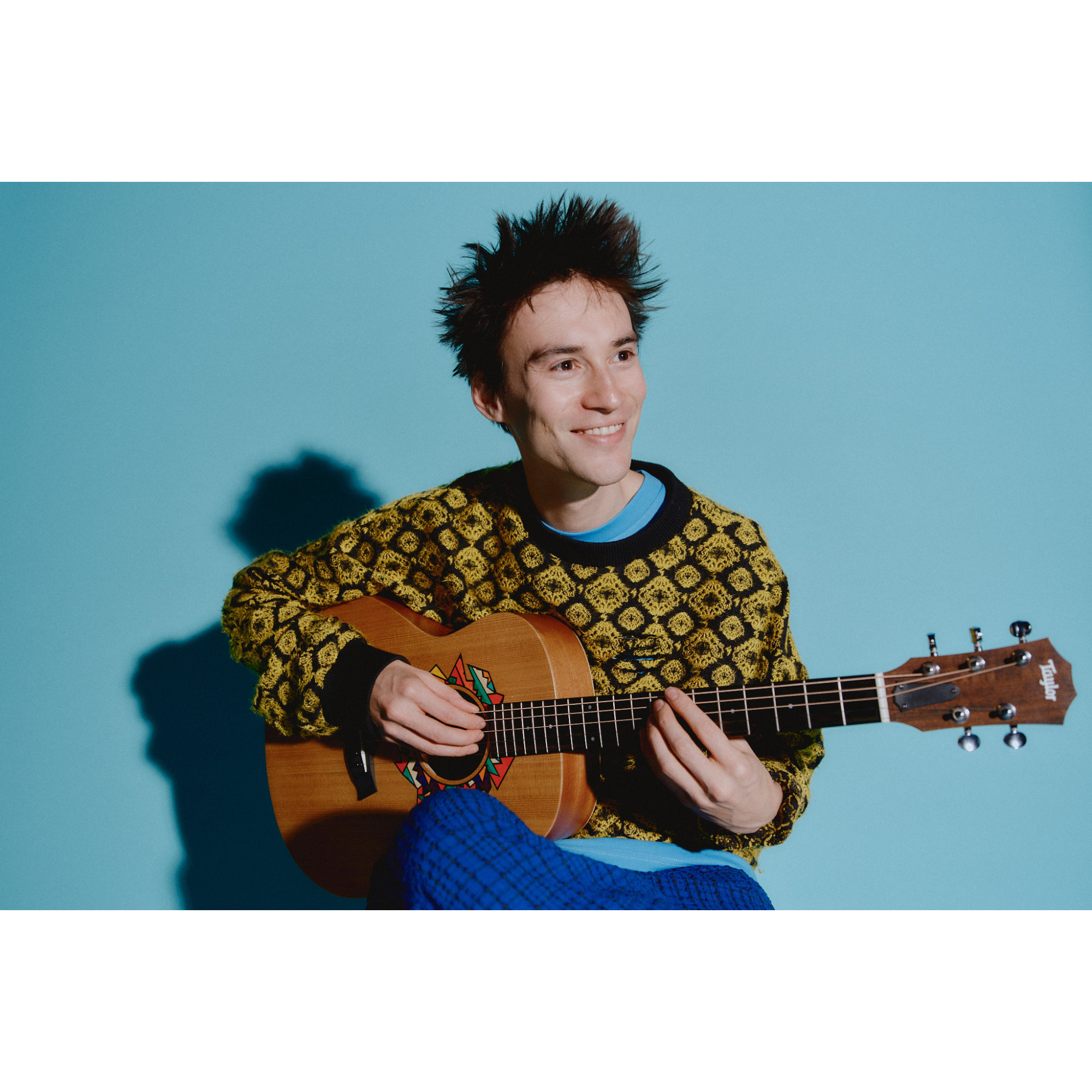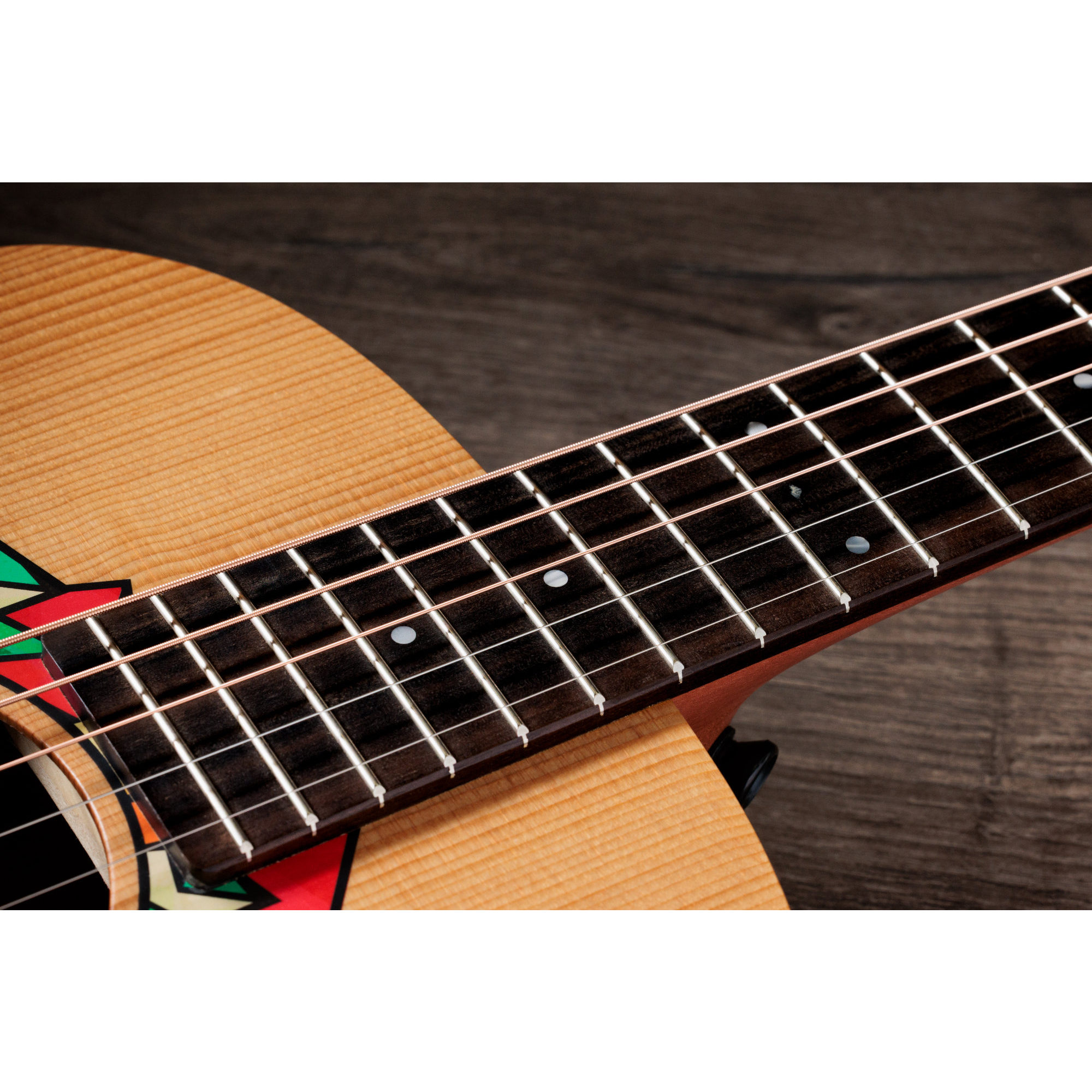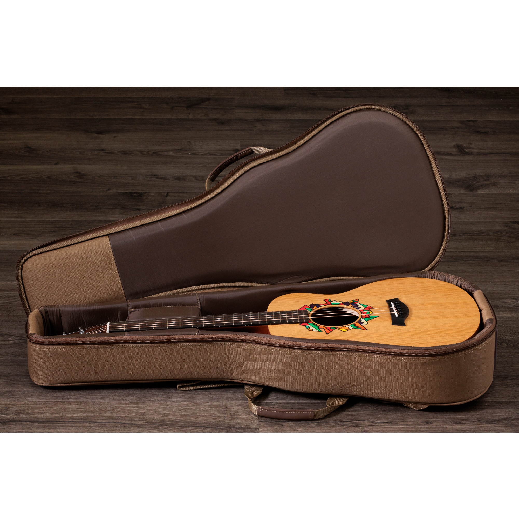 Inspiriert von der kraftvollen Klangfarbe, den kompakten Proportionen und der vielseitigen Persönlichkeit der GS Mini hat Jacob dem beliebten Taylor-Modell seinen ganz eigenen ästhetischen Stempel aufgedrückt. In Zusammenarbeit mit den Designern von Taylor hat Jacob ein individuelles asymmetrisches Rosetten-Design entworfen, das sich durch lebendige Farben und geometrische Abstraktion auszeichnet.