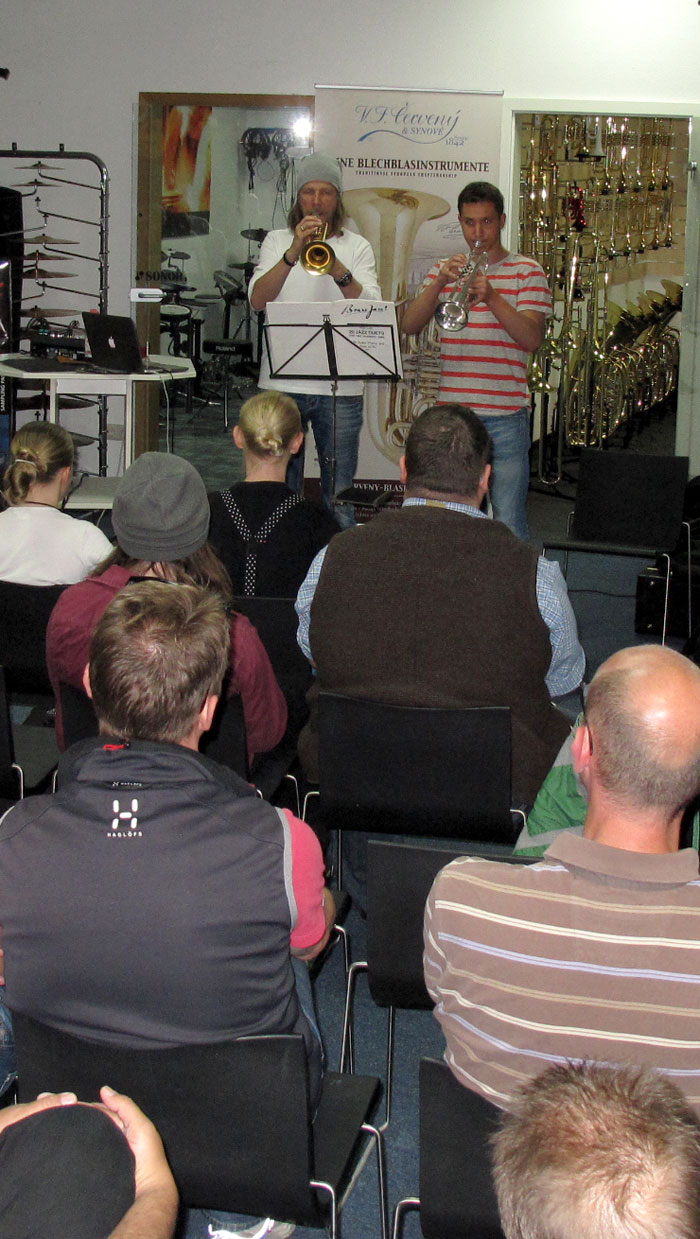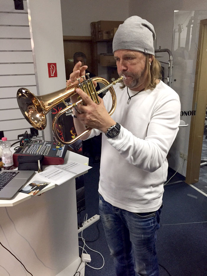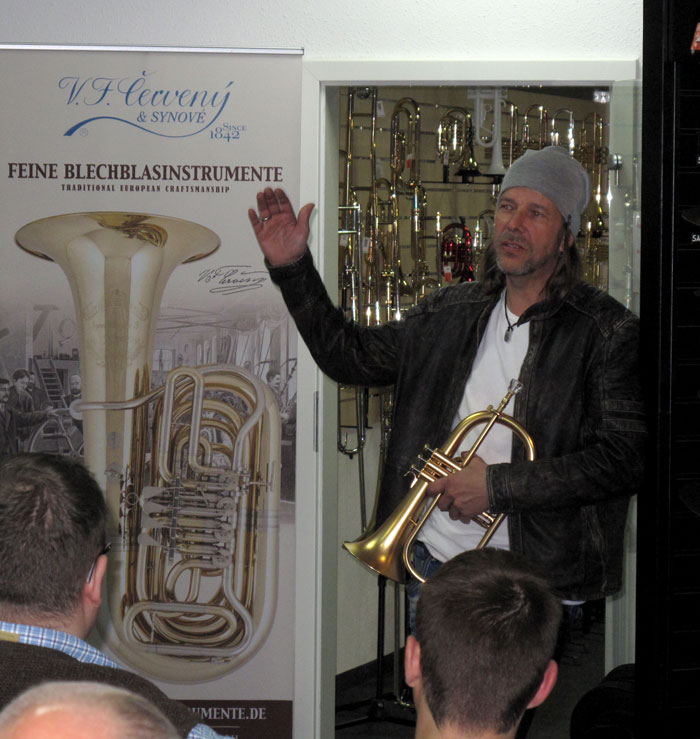 Der Workshop war, natürlich auch dank des sympathischen „Hauptdarstellers“, eine wirklich geniale Angelegenheit in absolut entspannter Atmosphäre. Rüdiger nahm sich Zeit, auf die individuellen Belange aller Teilnehmer einzeln einzugehen und verriet Kniffe und Tipps zu Ansatz, Atemtechnik, zum Spiel in hohen Lagen, zur Improvisation und vielem mehr. Auch Mundstücke und Instrumente der anwesenden Besucher wurden von Rüdiger getestet.